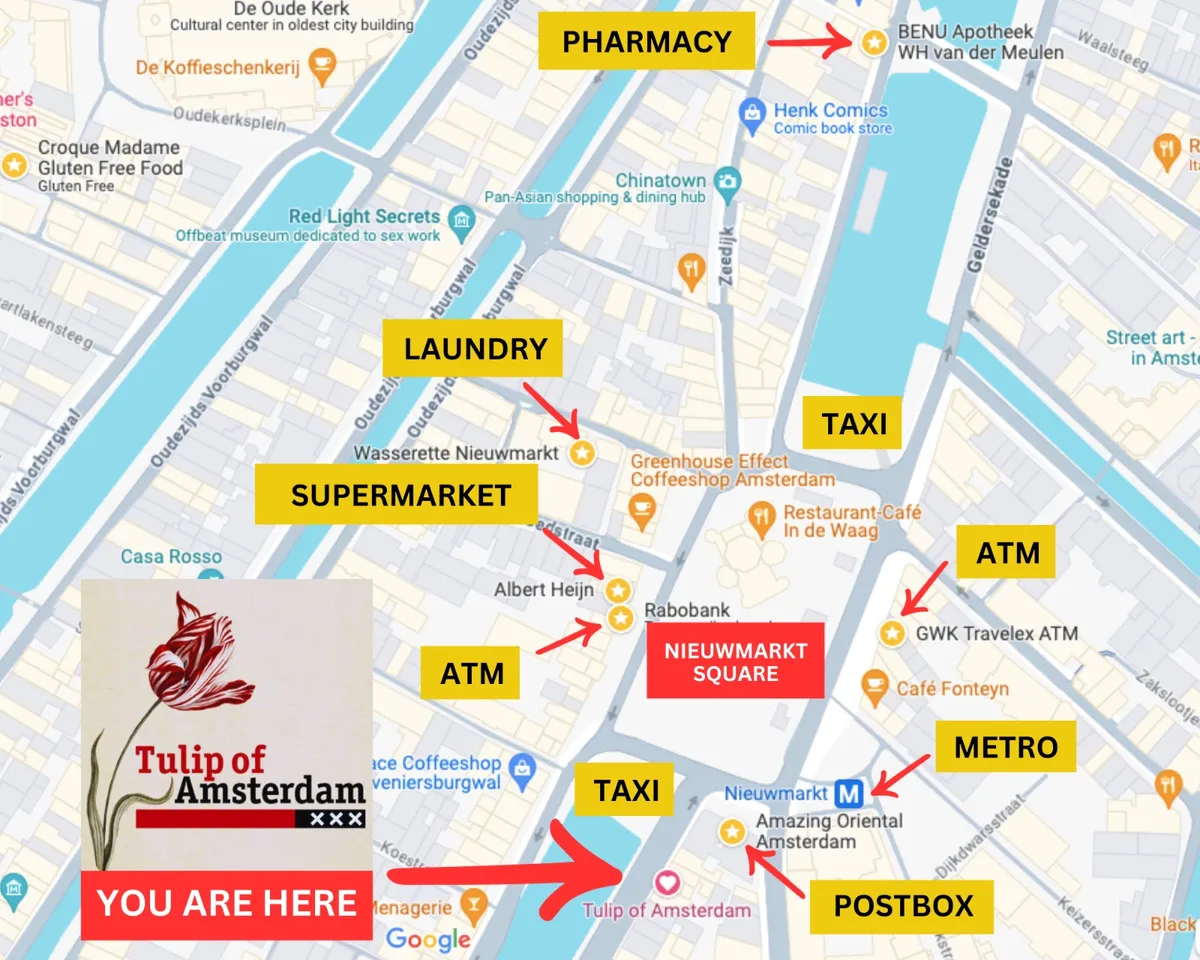 The nearest ATMs are located at Nieuwmarkt Square (within 1 min walking) One of which is Rabobank next to Albert Heijn Supermarket, and another two on the other side of Nieuwmarkt Square, next to Cotton Club.